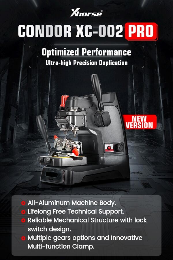 Revolutionary Design for Seamless Efficiency The Original Xhorse Condor XC-002 Pro is a game-changing manual key cutting machine that delivers unparalleled performance. With a brand-new design, the XC-002 Pro features a lock switch for quick switching between probes and cutters, eliminating the need for an Allen wrench. This innovation ensures central clamping of the probe and cutter, making the cutting process smooth and efficient.