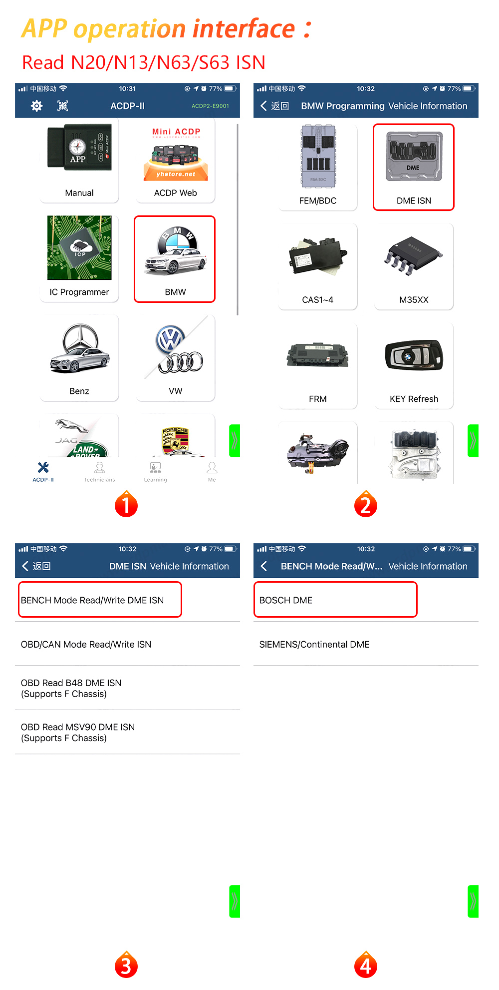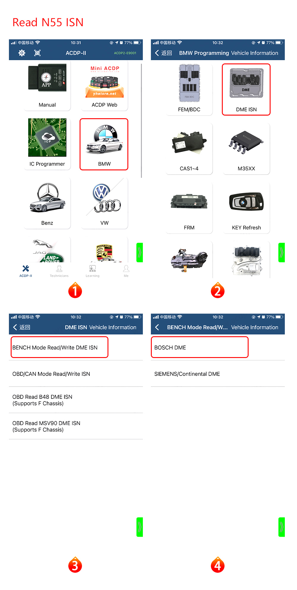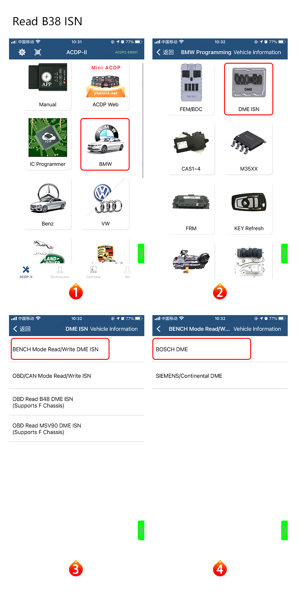 - Support BMW N20/N13/N63/S63/N55/B38 DME bench mode read/write ISN (require module 3 authorization).