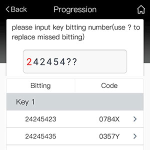 Progressioning (Fill) You know some, but not all, of the cuts on your customer's key? Enter the info you know (key type and some cuts) and the software gives you the possibilities for the unknown cuts to help make a fully working key. (Internet connection required) |