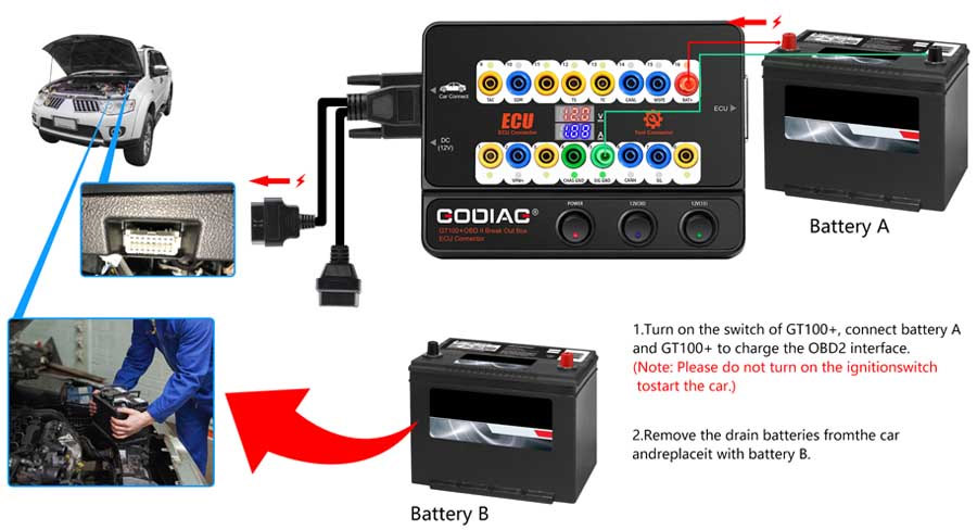 Since there's failure or missing antitheft remote control data of some vehicles when the battery is dismantled, the auxiliary power supply aims at supplying power to the vehicle through GT100+ before replacing the battery to sustain the power supply to the vehicle. It guarantees the vehicle ECU is power connected during replacement of the battery.