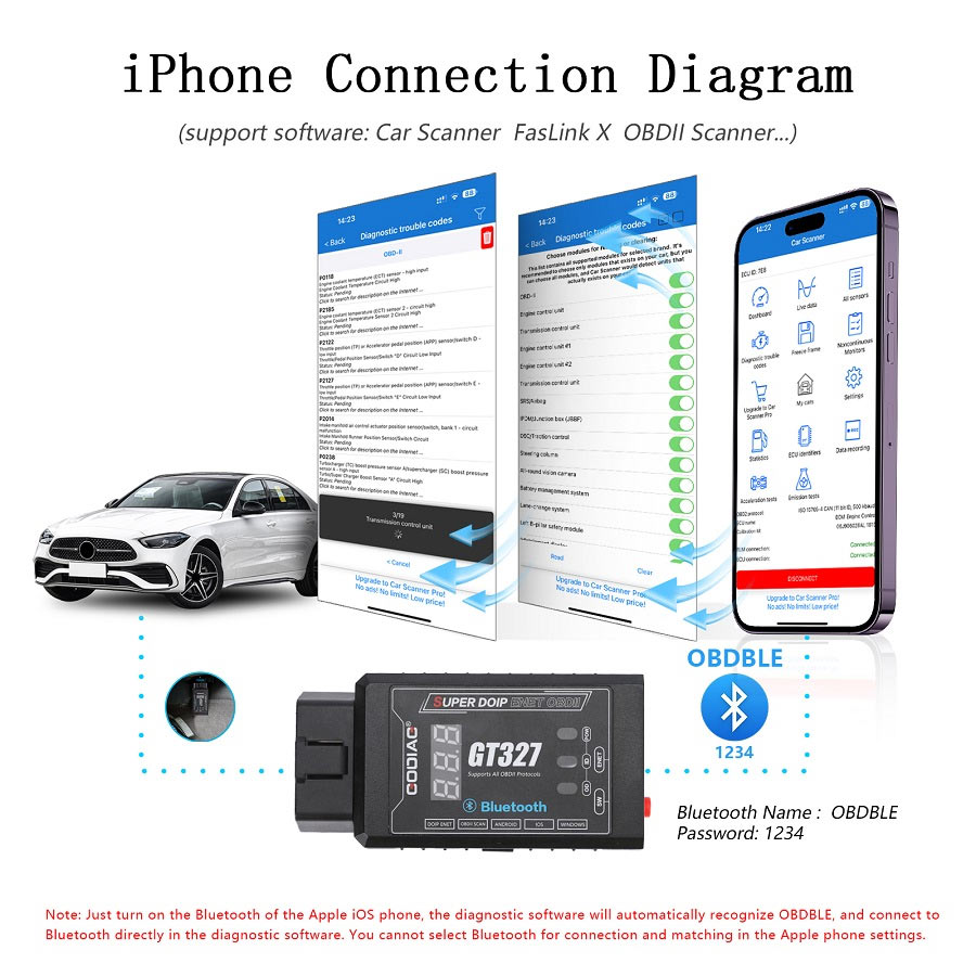 - Compatible with iPhones via Bluetooth (Bluetooth name: OBD BLE).