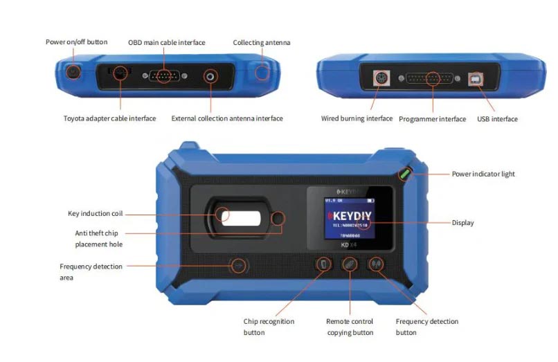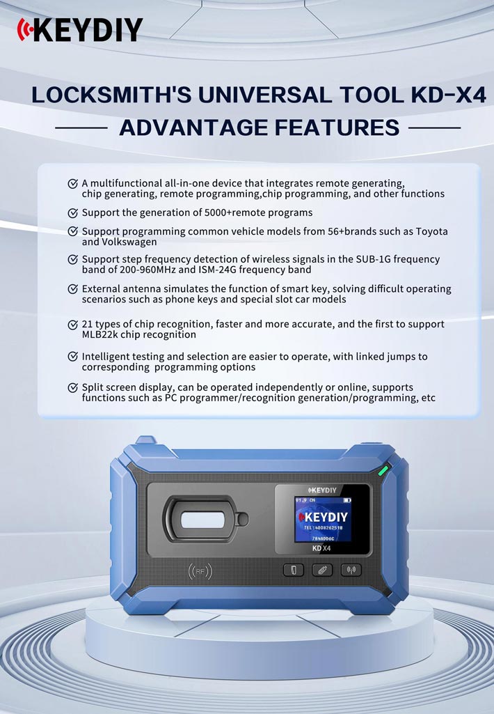 With exclusive access to advanced industry-leading features, the KD-X4 supports a range of functionalities, including frequency detection (compatible with 2.4G), remote control generation, remote control simulation, keyless remote simulation, remote control copying, chip recognition and copying, chip generation, chip acquisition, key unlocking, IMMO programming, programmer data reading and writing, online upgrades, and more.