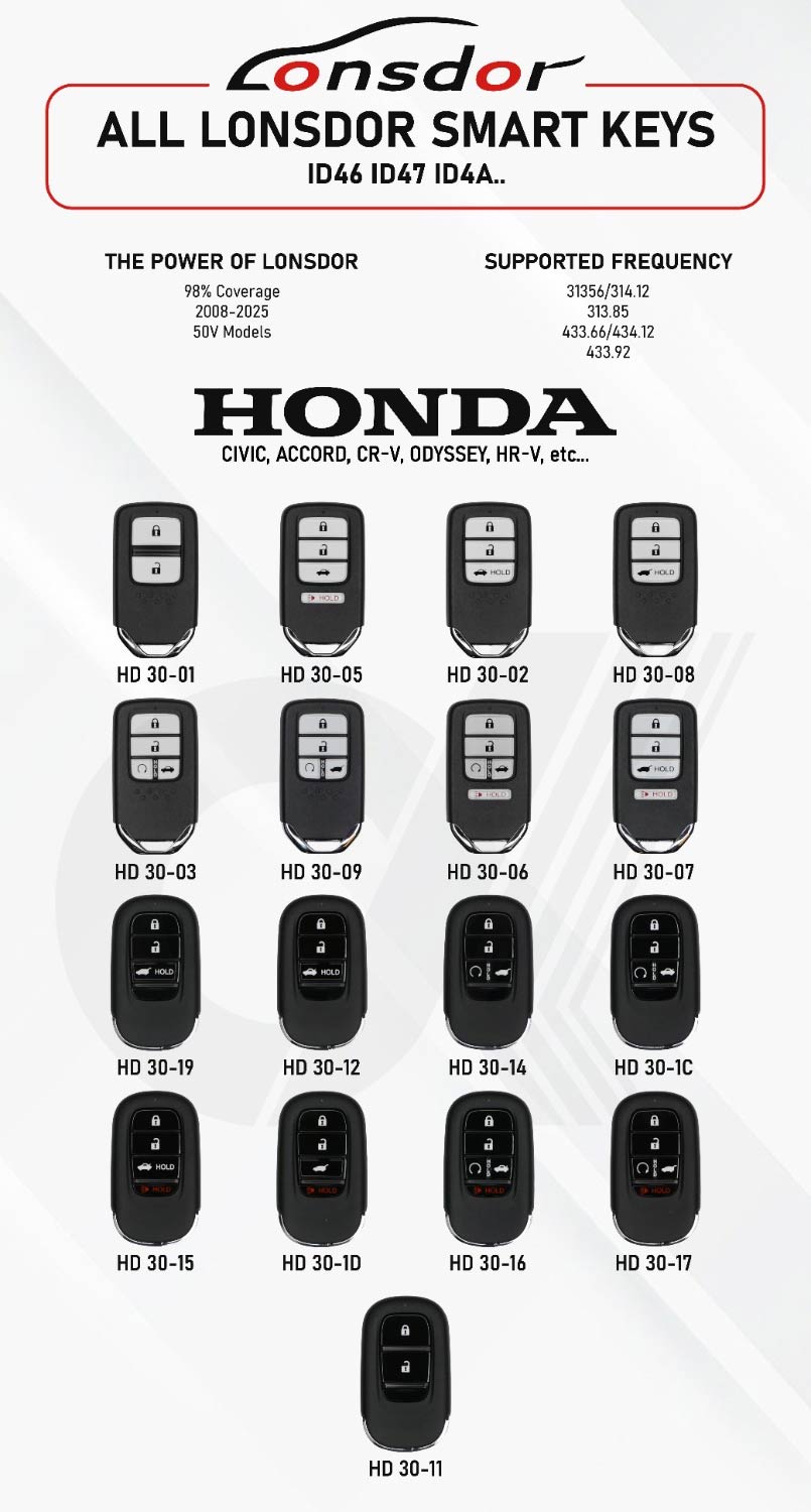 The Lonsdor HD30-0C Universal Smart Key is a high-quality replacement solution designed for a wide range of Honda vehicles from 2013 to 2025. Offering up to 98% vehicle coverage, this smart key supports multiple chip types and frequencies, making it an ideal choice for professional locksmiths and automotive technicians.