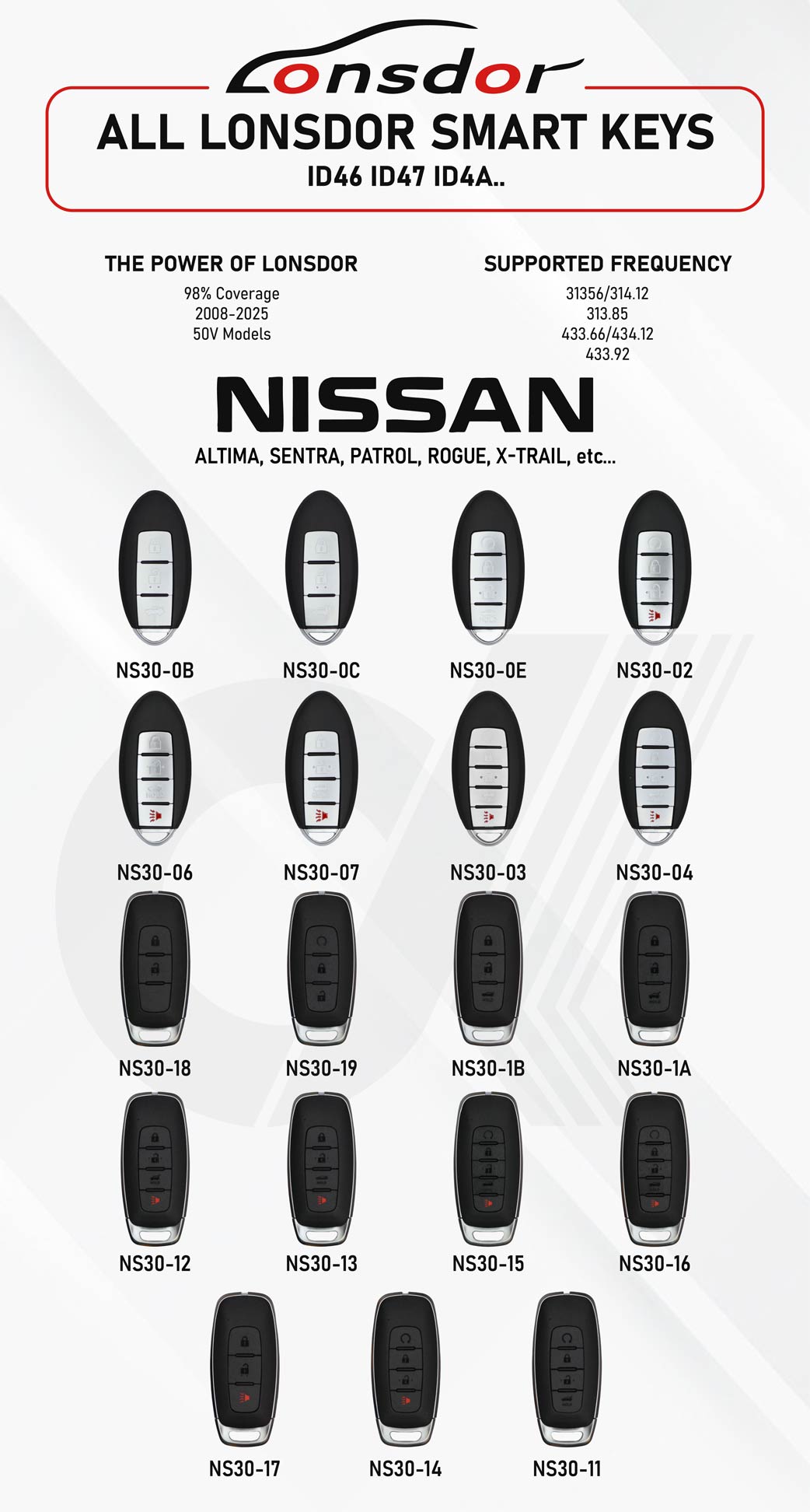 The Lonsdor NS30-16 Universal Smart Key is a high-quality replacement solution designed for a wide range of Nissan and Infiniti vehicles from 2008 to 2025. Offering up to 98% vehicle coverage, this smart key supports multiple chip types and frequencies, making it an ideal choice for professional locksmiths and automotive technicians.