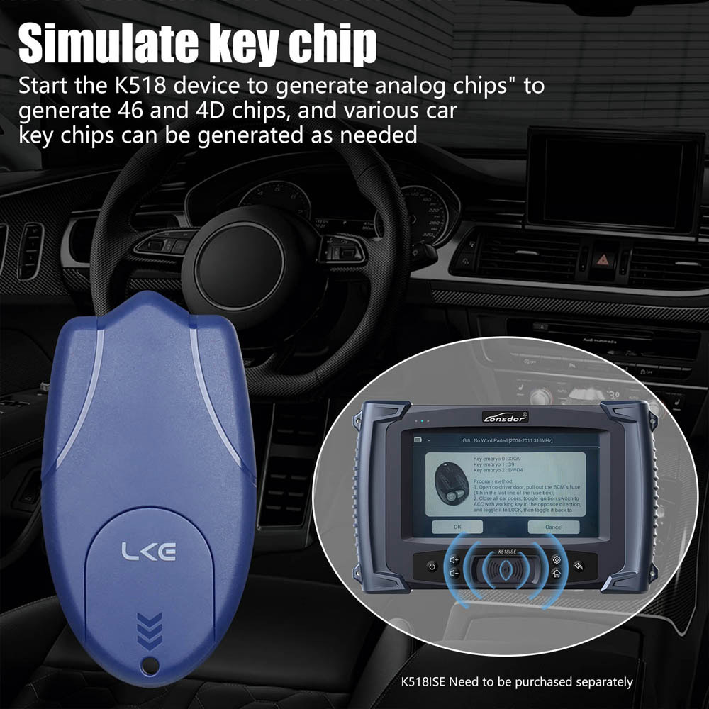To initiate the K518 device, insert the LKE emulator into the K518 card slot. Navigate to the "Special function" option within the menu interface and select "Analog chip->Generate analog chip." This process allows you to create both 46 and 4D chips, catering to your specific requirements. For instance, you can generate a 46 chip to produce key chips for vehicle models such as Great Wall Motor, Zotye Auto, Geely, and others. Similarly, the 4D chip can be utilized to generate key chips suitable for Toyota, Lexus, Subaru, and various other vehicles.