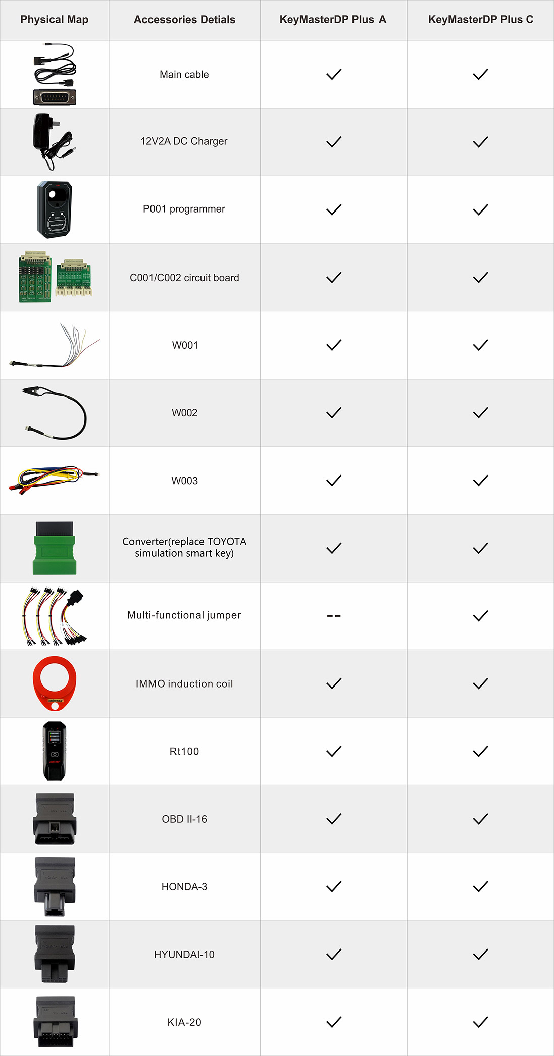 - Adapter (P001 programmer, C001 circuit board, C002 circuit board, W001 data cable, W002 data cable, W003 data cable, Toyota smart key emulator)