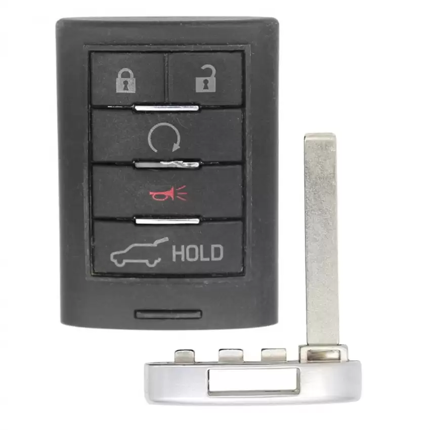 This FOBIKO Cadillac push to start key has 5 buttons, Lock, Unlock, Panic, Remote Start, Rear Hatch and comes including a battery CR2032, designed to work with vehicles that equipped with push start button (push to start cars).
