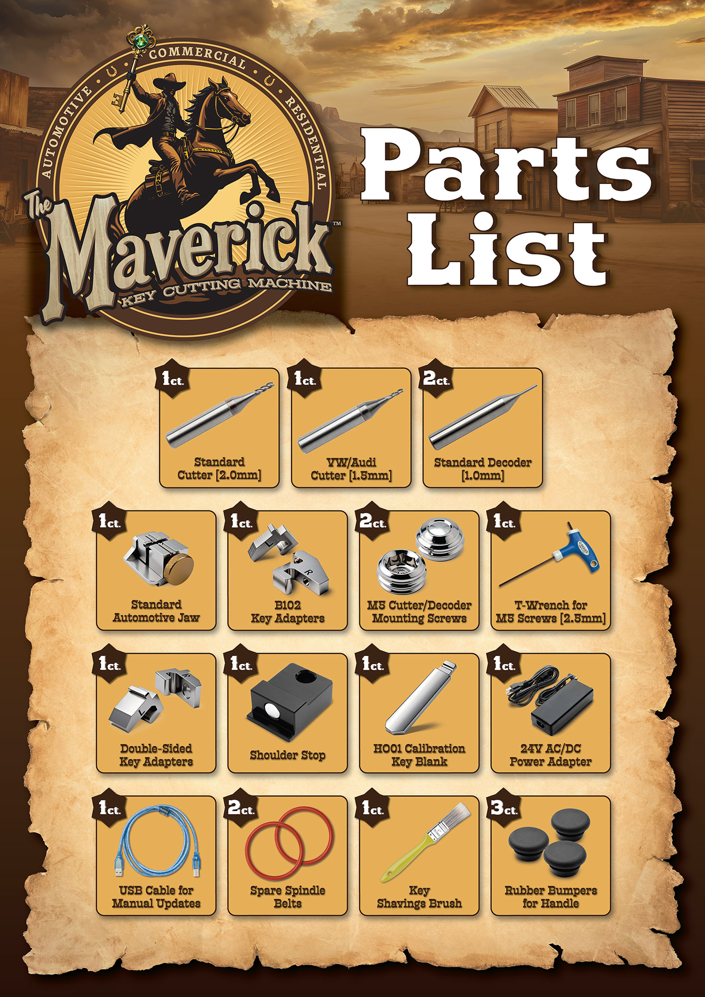 Includes all standard components, cutters, adapters, and accessories included with every Maverick™ machine.