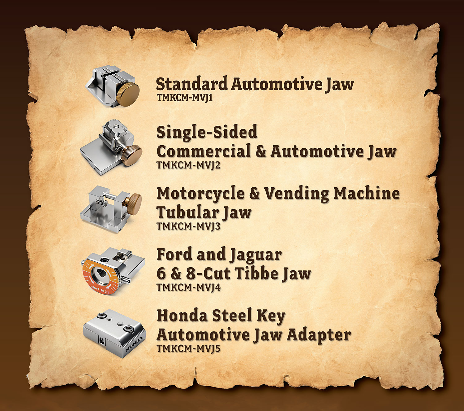 View optional jaws and adapters available for expanded key coverage, including Tibbe, Tubular, Honda, and more.
