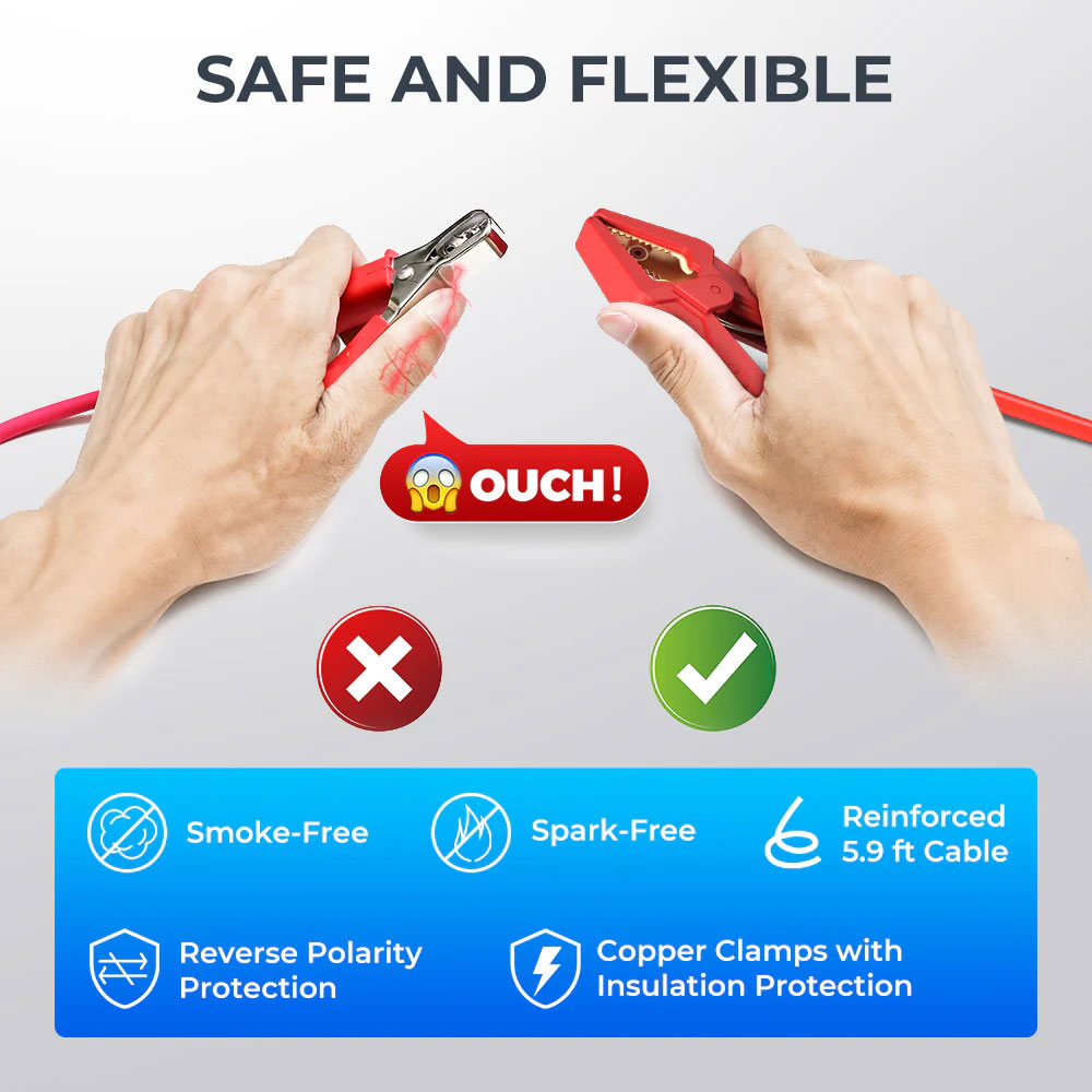 Equipped with high-quality, sturdy, smoke-free, and spark-free copper clamps, the device prioritizes safety. Its reverse polarity protection feature serves as a safeguard against battery damage, ultimately saving users money on repair and replacement costs.