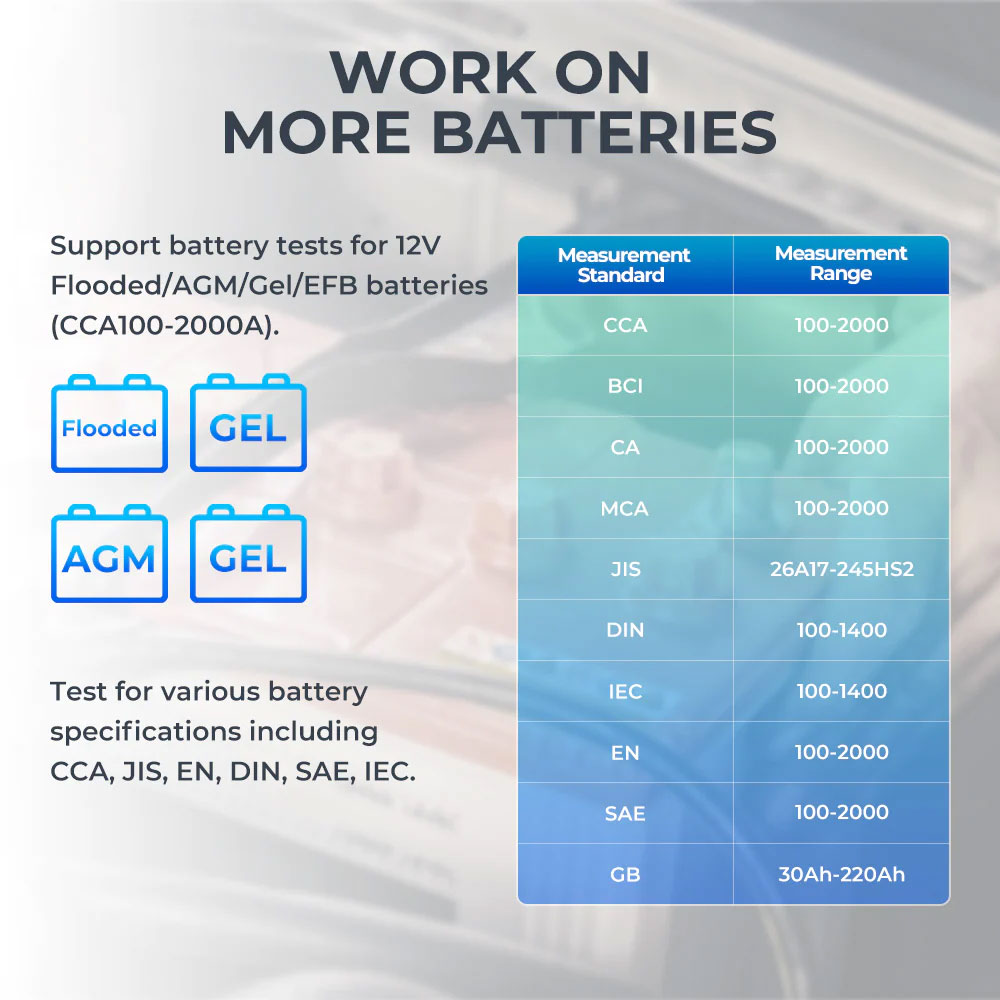 Supporting charging tests and cranking tests for 12V & 24V Lead-Acid batteries, performing battery tests on 12V batteries. This tester enables professionals to test passenger cars and heavy-duty. With the BT600, technicians will be able to complete even more jobs.