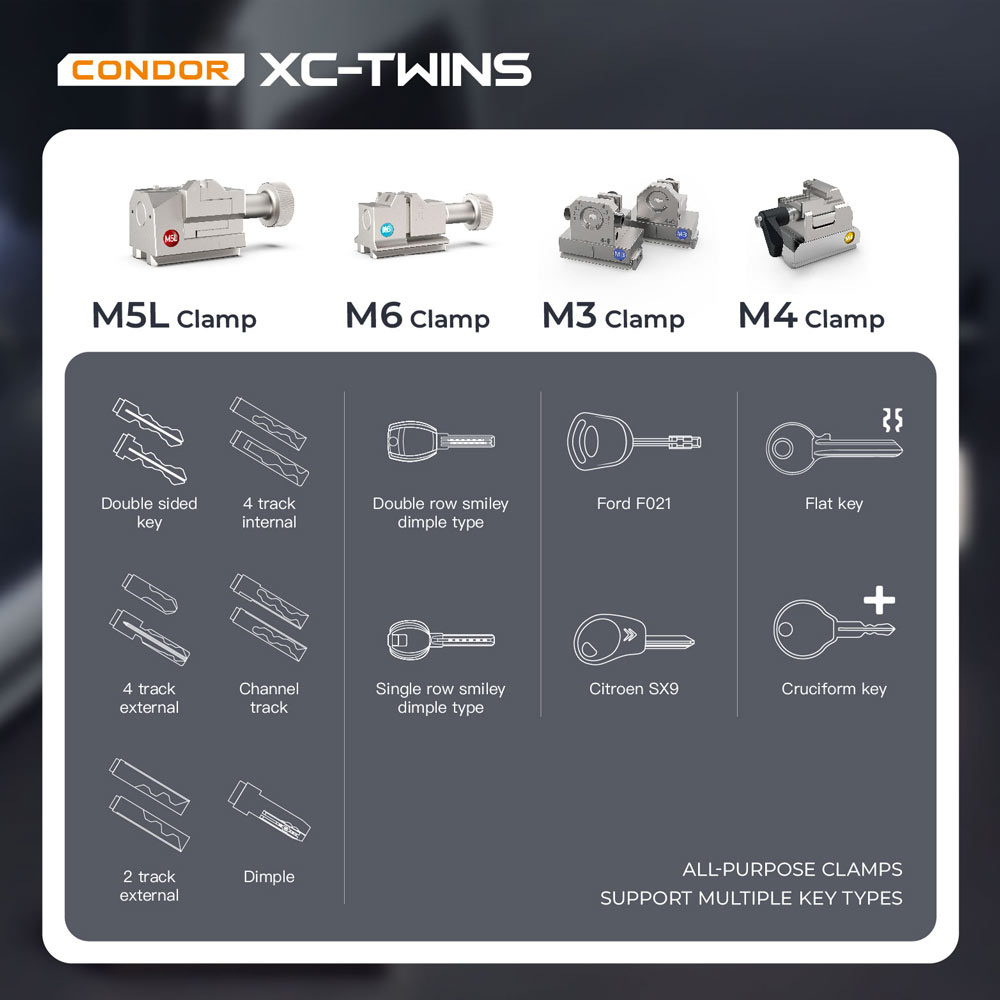 Includes multiple functional clamps (M5L, M6, M3, M4) to handle a wide range of applications, supporting key duplication for vehicles, homes, motorcycles, and more.