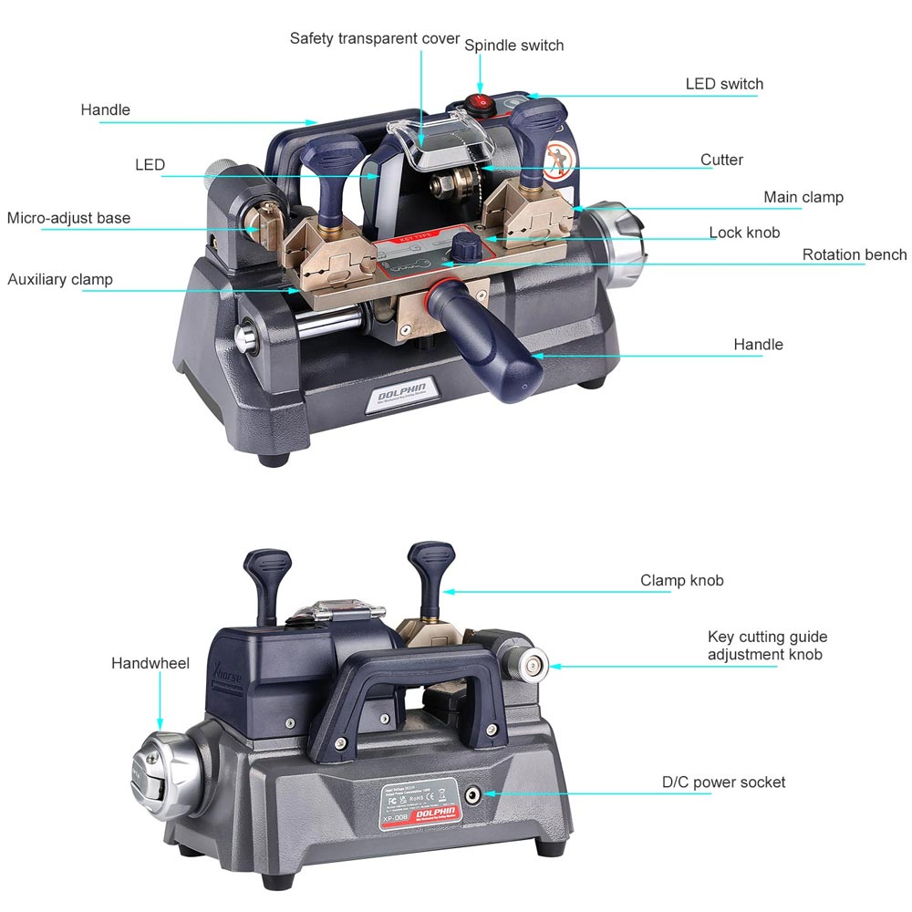 Ultra-High Precision with Micro-Adjustment Base Engineered for precision, the Dolphin XP-008 includes an innovative all-direction micro-adjustment base. This system, featuring a key cutting guide and micro-adjustment knob, allows for ultra-high precision key duplication, making it a reliable tool for locksmiths who demand accuracy.