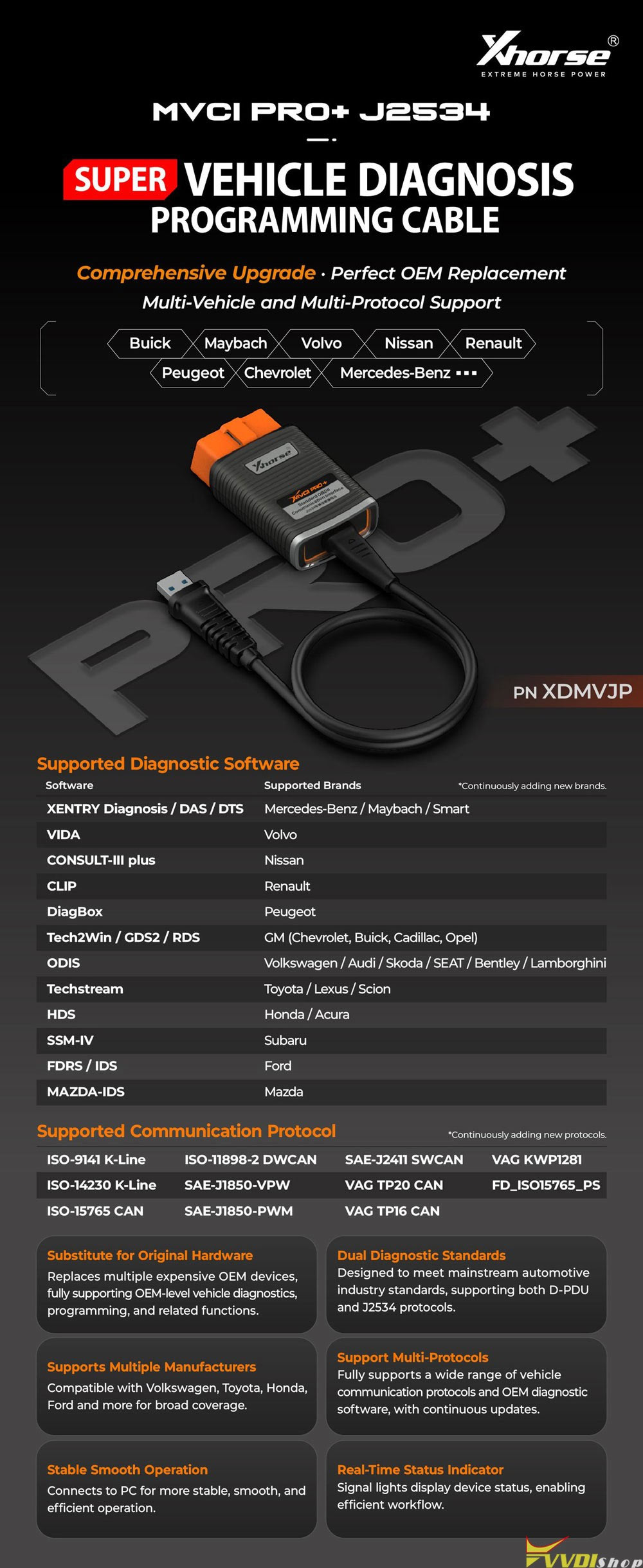The 2025 XHORSE MVCI PRO+ J2534 (PN: XDMVJPGL - New version of XDMVJ0GL) is the newest generation OEM-level diagnostic and programming cable, designed as a perfect replacement for multiple expensive OEM interfaces. It supports J2534 and D-PDU, works directly with original dealer software, and covers a wide range of manufacturers including Toyota, Lexus, Honda, Acura, VAG, Volvo, Nissan, GM, Ford, Mazda, Subaru, PSA, Renault, and more.