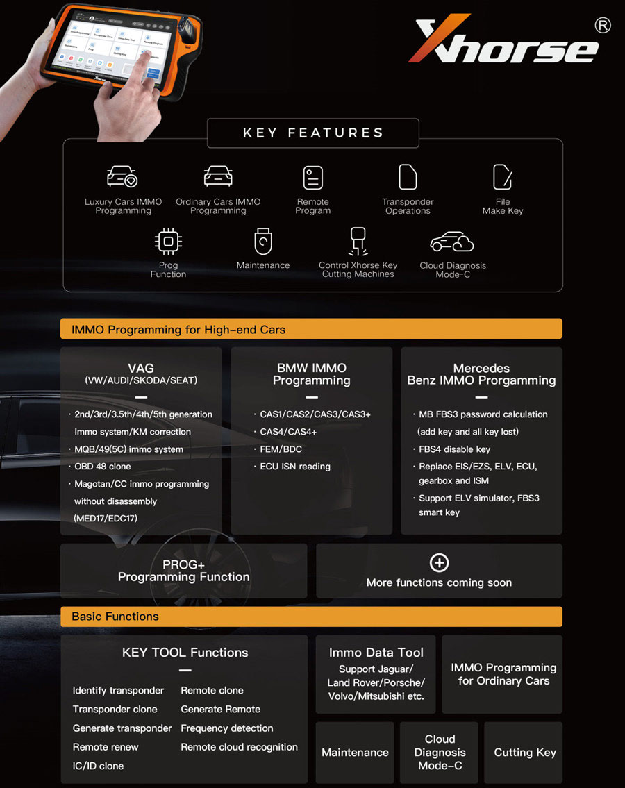 - Supports IMMO programming for luxury cars such as BMW, Mercedes-Benz, Audi, VW, etc.