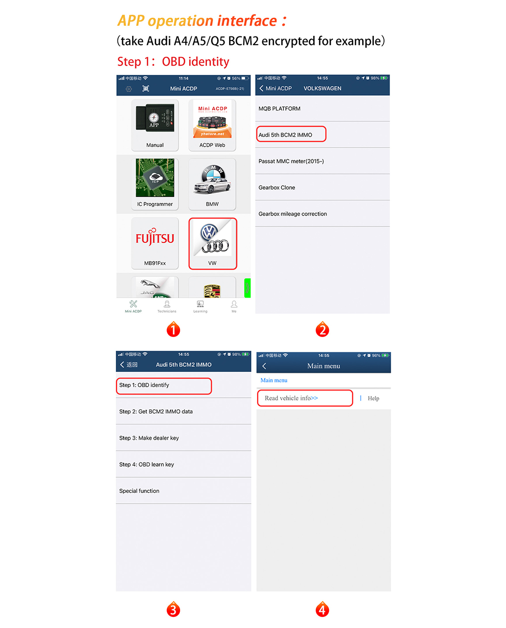 - Supports Audi Gen5 unencrypted version and partial encrypted version BCM2 to read immo data by OBD